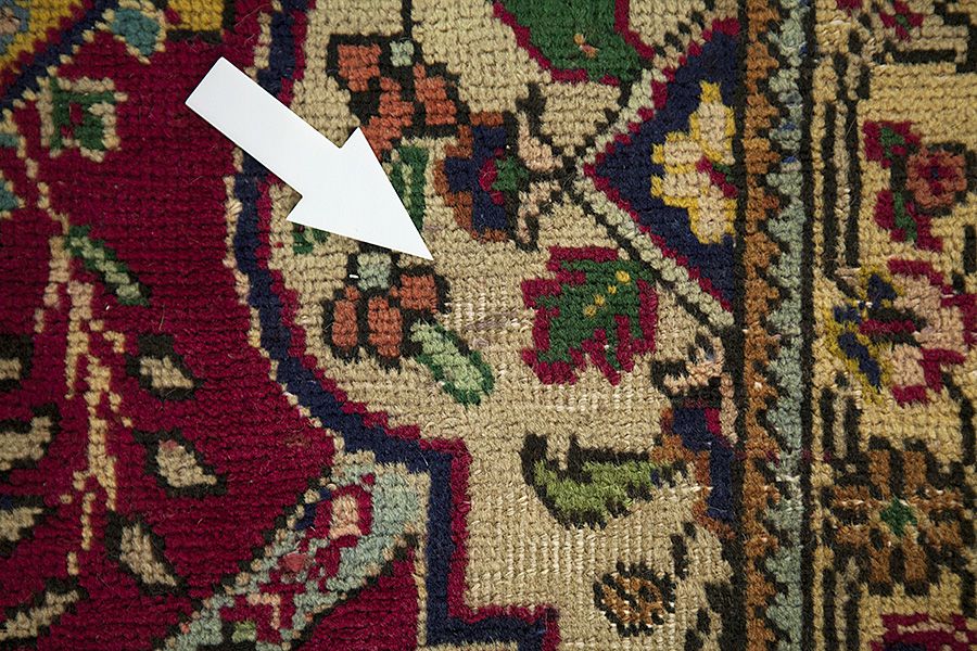 Abrash: Due to the different amount of grease in the wool and the added salt during the process of dyeing, the wool has got a varying colour absorbance. This is not very visible before weaving. During the weaving though, lines of the same colour are formed in the rug. This is called Abrash (which in Farsi means little cloud) and it shows that the wool was not manufactured using chemical means and marks the naturalness and authenticity of the rugs. Examples