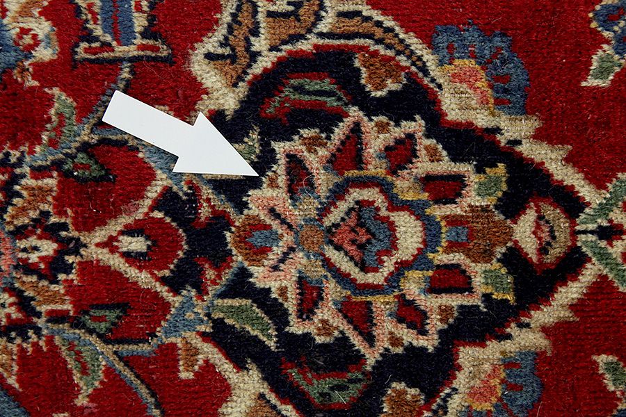 Abrash: Due to the different amount of grease in the wool and the added salt during the process of dyeing, the wool has got a varying colour absorbance. This is not very visible before weaving. During the weaving though, lines of the same colour are formed in the rug. This is called Abrash (which in Farsi means little cloud) and it shows that the wool was not manufactured using chemical means and marks the naturalness and authenticity of the rugs. Examples