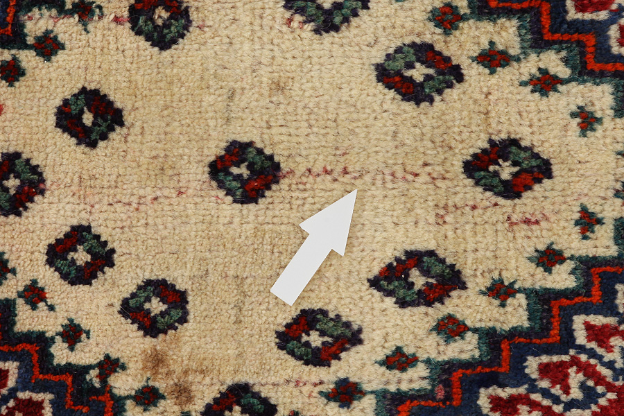 Abrash: Due to the different amount of grease in the wool and the added salt during the process of dyeing, the wool has got a varying colour absorbance. This is not very visible before weaving. During the weaving though, lines of the same colour are formed in the rug. This is called Abrash (which in Farsi means little cloud) and it shows that the wool was not manufactured using chemical means and marks the naturalness and authenticity of the rugs. Examples