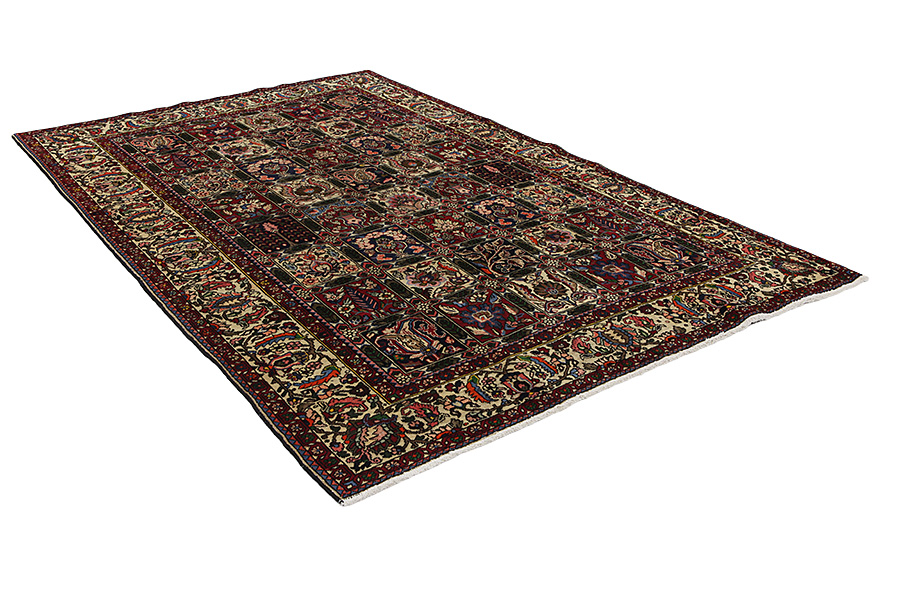 Bakhtiari Rugs : In the mountains Zagros, west of the city of Isfahan, around the town of Shahr-e-Kurd, live the nomads Bakhtiar. Their rugs are known for the design with various repeating squares in which flowers and animals are depicted. For this reason the design is called "garden"(Khesti). Their rugs are very durable with a dense weave and very good quality Persian wool coming from sheep grazing at a high altitude. The best Bakhtiari rugs with highest knot density are often called Bibibaff.