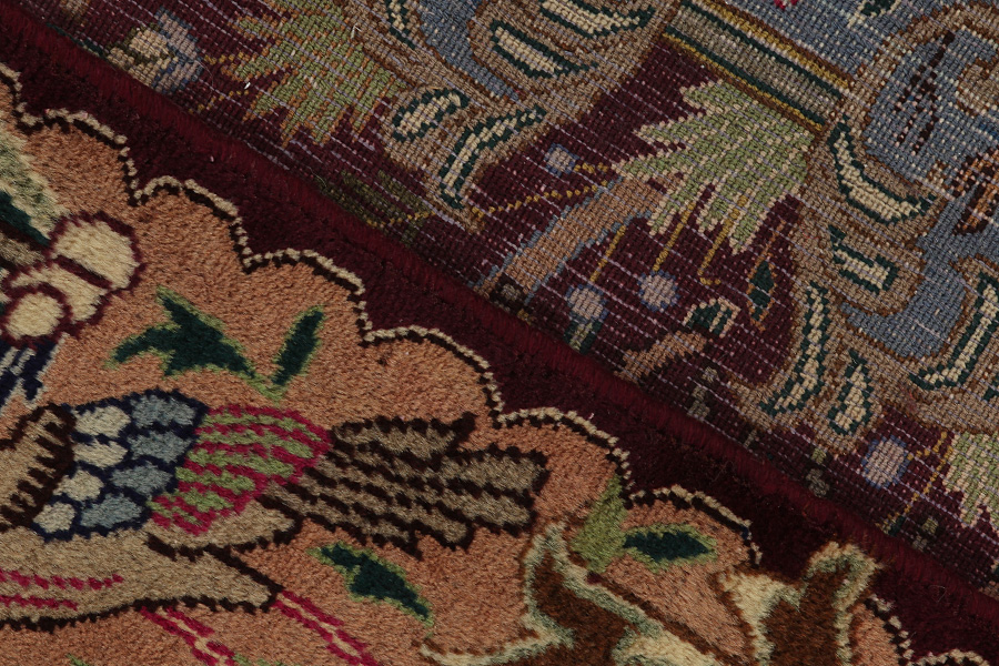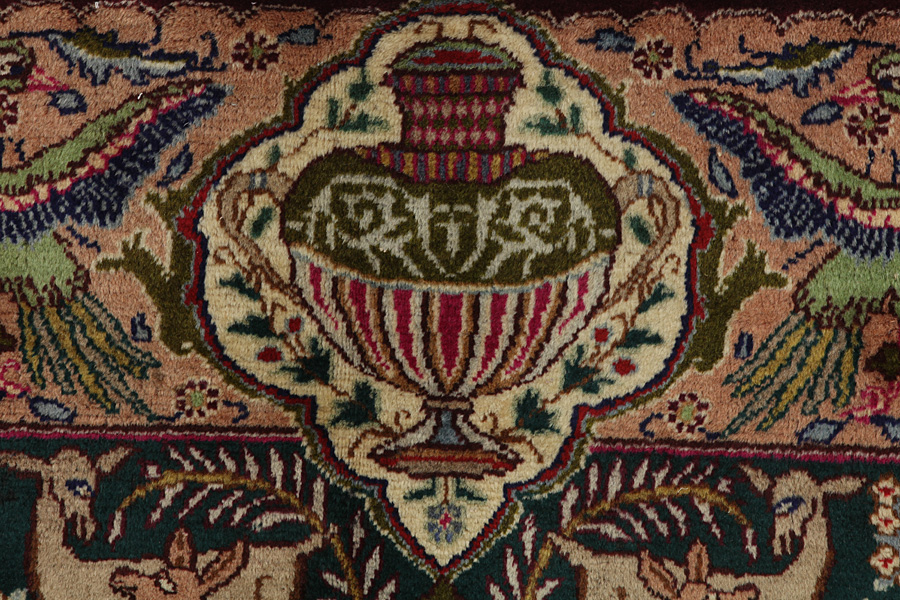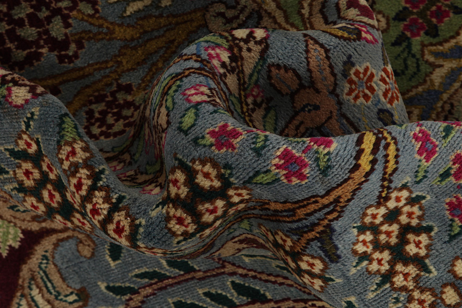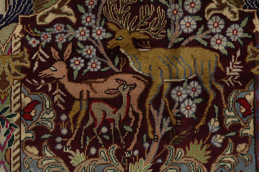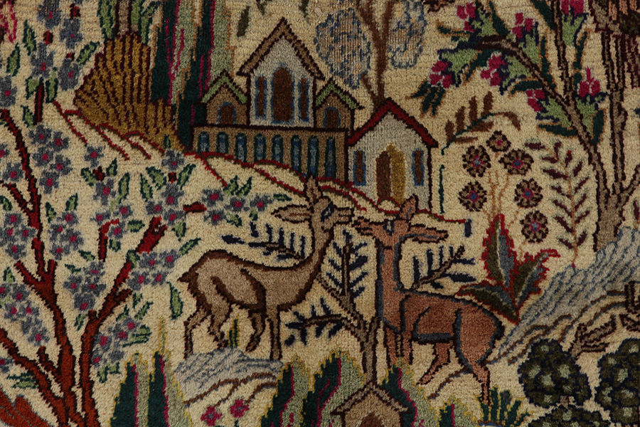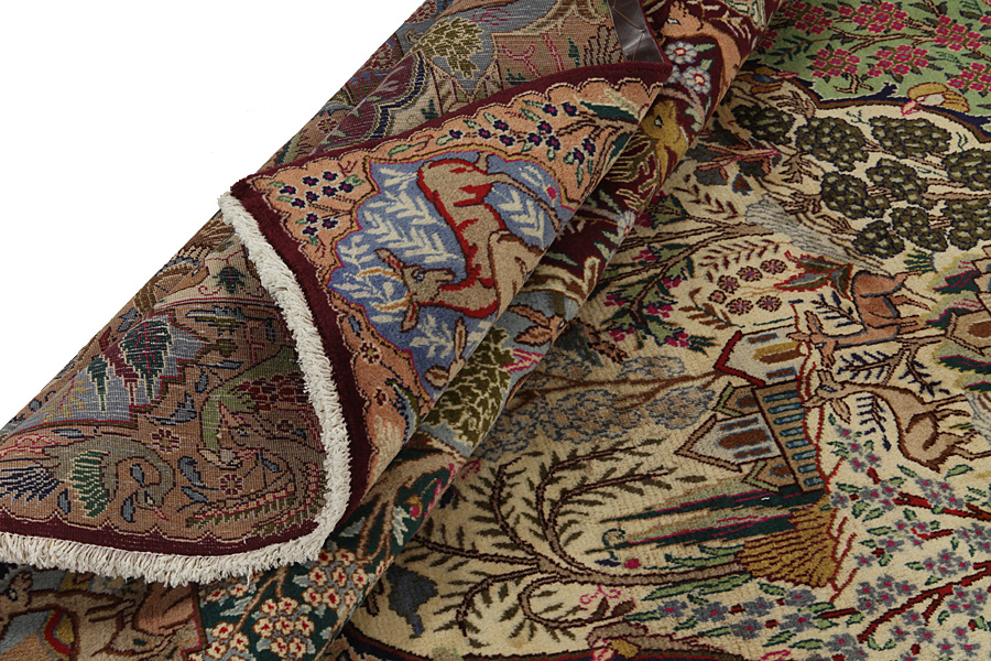 Kashmar Rugs : The city of Kashmar is located in the Khorasan province southwest of the city Mashad in Eastern Iran. Exquisite high quality rugs have been woven for centuries there. The rugs are woven thick, with fine soft wool in beautiful blue colours in contrast with cream and ivory beige. In newer rugs they use soft green, red and brown. Characteristic of Kashmar rugs are the large sizes and the unique designs that look like paintings with trees, flowers and domes of mosques.Also depicted are representations that recount historical events, major incidents from Persian history or a historically known person or the story of a revered Persian king. In Kashmar they weave elegant masterpieces of colour harmony, complexity of designs in detail, to show the Persian love of beauty and art. Kashmar rugs and rugs are durable and grow more beautiful with time.