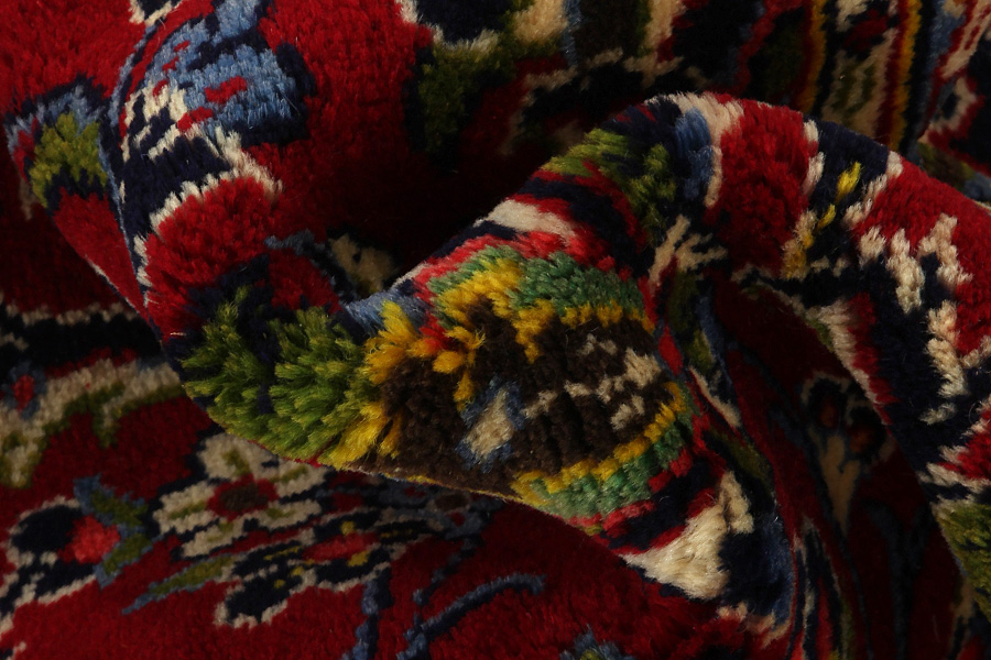 Abrash: Due to the different amount of grease in the wool and the added salt during the process of dyeing, the wool has got a varying colour absorbance. This is not very visible before weaving. During the weaving though, lines of the same colour are formed in the rug. This is called Abrash (which in Farsi means little cloud) and it shows that the wool was not manufactured using chemical means and marks the naturalness and authenticity of the rugs. Examples