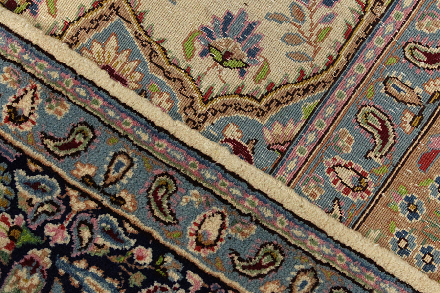 Abrash: Due to the different amount of grease in the wool and the added salt during the process of dyeing, the wool has got a varying colour absorbance. This is not very visible before weaving. During the weaving though, lines of the same colour are formed in the rug. This is called Abrash (which in Farsi means little cloud) and it shows that the wool was not manufactured using chemical means and marks the naturalness and authenticity of the rugs. Examples