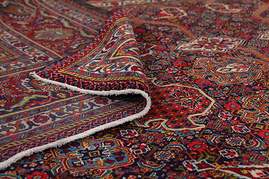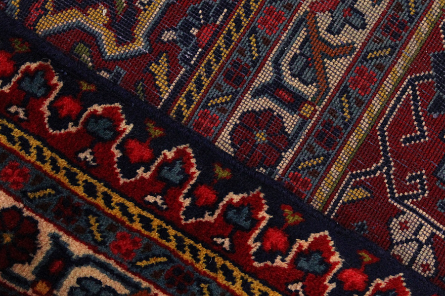 Abrash: Due to the different amount of grease in the wool and the added salt during the process of dyeing, the wool has got a varying colour absorbance. This is not very visible before weaving. During the weaving though, lines of the same colour are formed in the rug. This is called Abrash (which in Farsi means little cloud) and it shows that the wool was not manufactured using chemical means and marks the naturalness and authenticity of the rugs. Examples