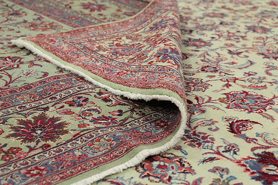 Abrash: Due to the different amount of grease in the wool and the added salt during the process of dyeing, the wool has got a varying colour absorbance. This is not very visible before weaving. During the weaving though, lines of the same colour are formed in the rug. This is called Abrash (which in Farsi means little cloud) and it shows that the wool was not manufactured using chemical means and marks the naturalness and authenticity of the rugs. Examples