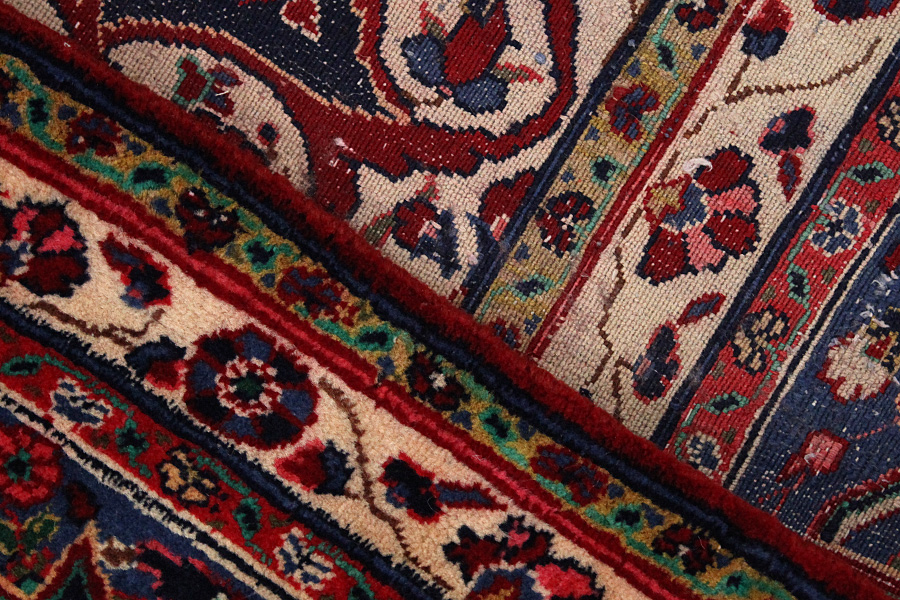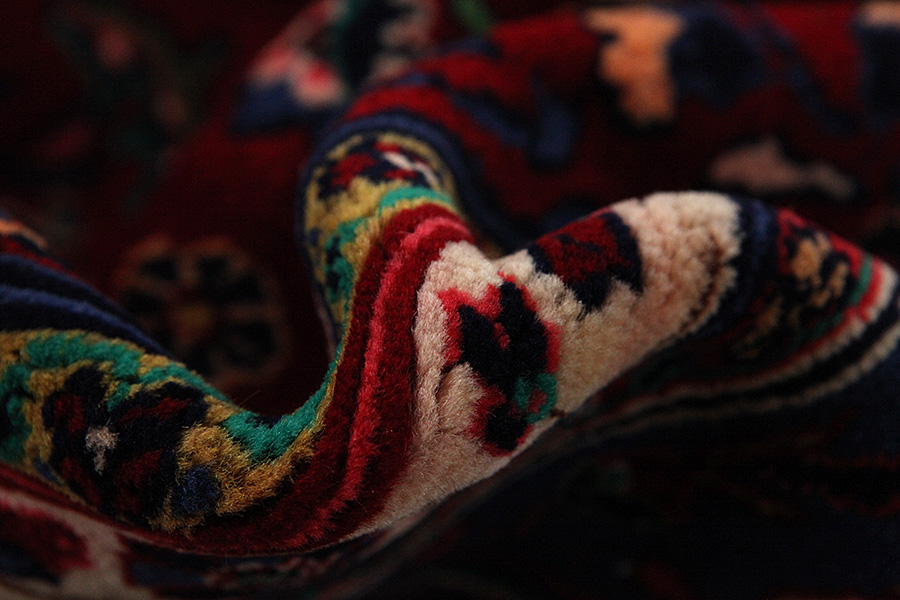 Abrash: Due to the different amount of grease in the wool and the added salt during the process of dyeing, the wool has got a varying colour absorbance. This is not very visible before weaving. During the weaving though, lines of the same colour are formed in the rug. This is called Abrash (which in Farsi means little cloud) and it shows that the wool was not manufactured using chemical means and marks the naturalness and authenticity of the rugs. Examples