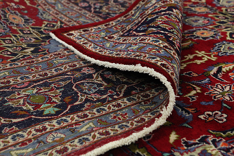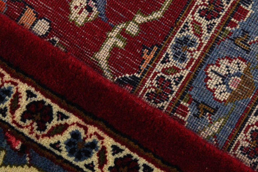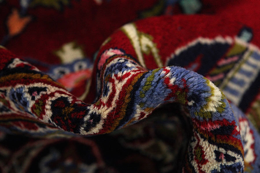 Abrash: Due to the different amount of grease in the wool and the added salt during the process of dyeing, the wool has got a varying colour absorbance. This is not very visible before weaving. During the weaving though, lines of the same colour are formed in the rug. This is called Abrash (which in Farsi means little cloud) and it shows that the wool was not manufactured using chemical means and marks the naturalness and authenticity of the rugs. Examples