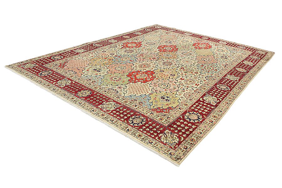Bakhtiari Rugs : In the mountains Zagros, west of the city of Isfahan, around the town of Shahr-e-Kurd, live the nomads Bakhtiar. Their rugs are known for the design with various repeating squares in which flowers and animals are depicted. For this reason the design is called "garden"(Khesti). Their rugs are very durable with a dense weave and very good quality Persian wool coming from sheep grazing at a high altitude. The best Bakhtiari rugs with highest knot density are often called Bibibaff.