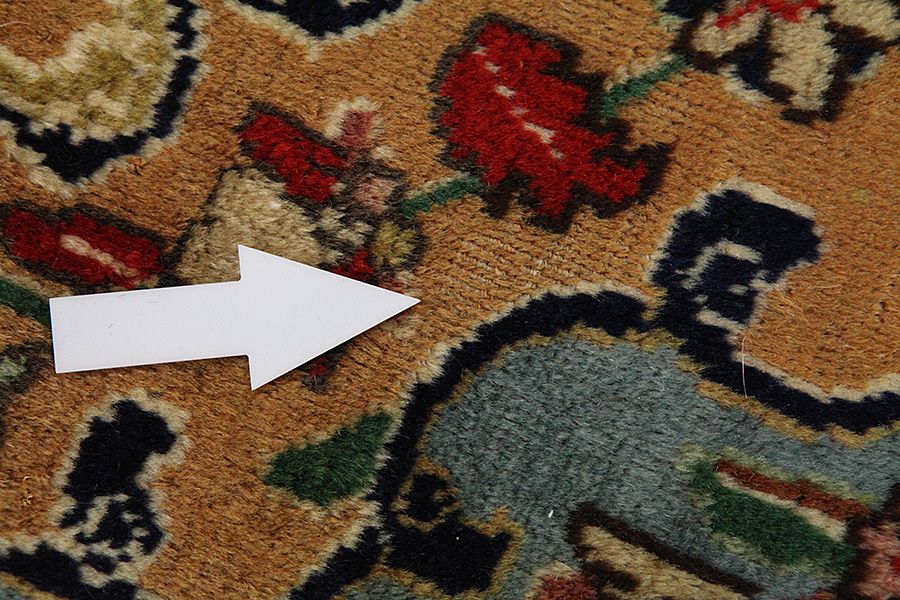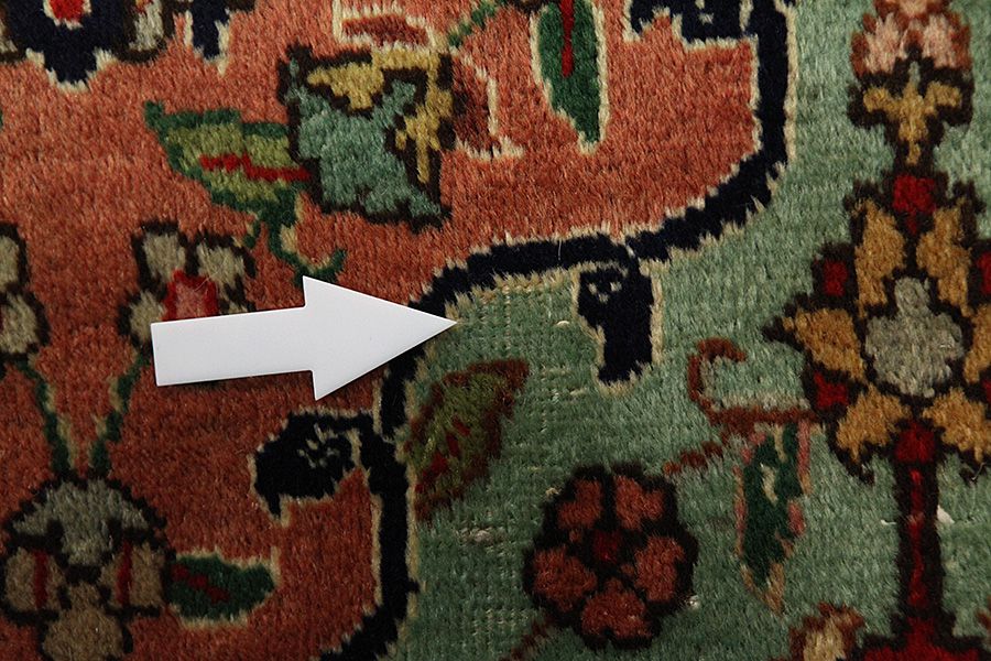 Abrash: Due to the different amount of grease in the wool and the added salt during the process of dyeing, the wool has got a varying colour absorbance. This is not very visible before weaving. During the weaving though, lines of the same colour are formed in the rug. This is called Abrash (which in Farsi means little cloud) and it shows that the wool was not manufactured using chemical means and marks the naturalness and authenticity of the rugs. Examples