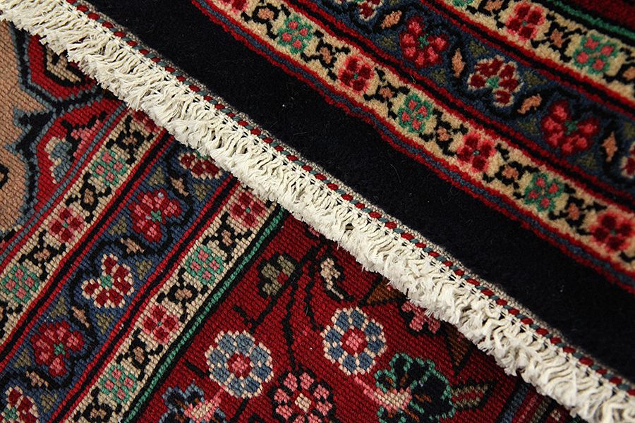 Abrash: Due to the different amount of grease in the wool and the added salt during the process of dyeing, the wool has got a varying colour absorbance. This is not very visible before weaving. During the weaving though, lines of the same colour are formed in the rug. This is called Abrash (which in Farsi means little cloud) and it shows that the wool was not manufactured using chemical means and marks the naturalness and authenticity of the rugs. Examples