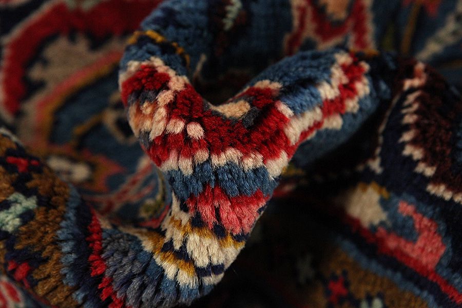 Abrash: Due to the different amount of grease in the wool and the added salt during the process of dyeing, the wool has got a varying colour absorbance. This is not very visible before weaving. During the weaving though, lines of the same colour are formed in the rug. This is called Abrash (which in Farsi means little cloud) and it shows that the wool was not manufactured using chemical means and marks the naturalness and authenticity of the rugs. Examples
