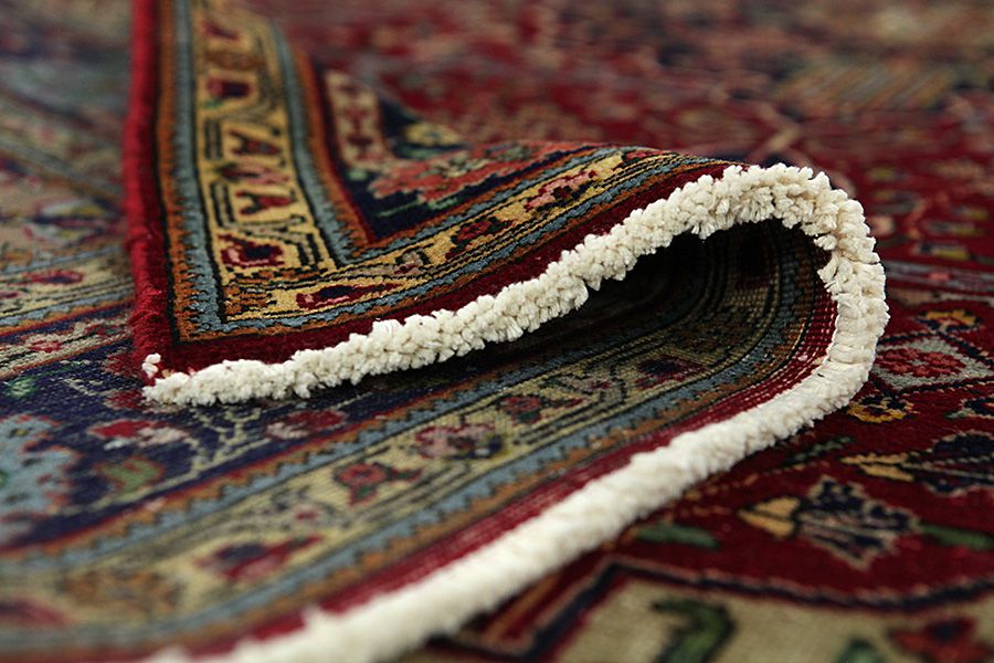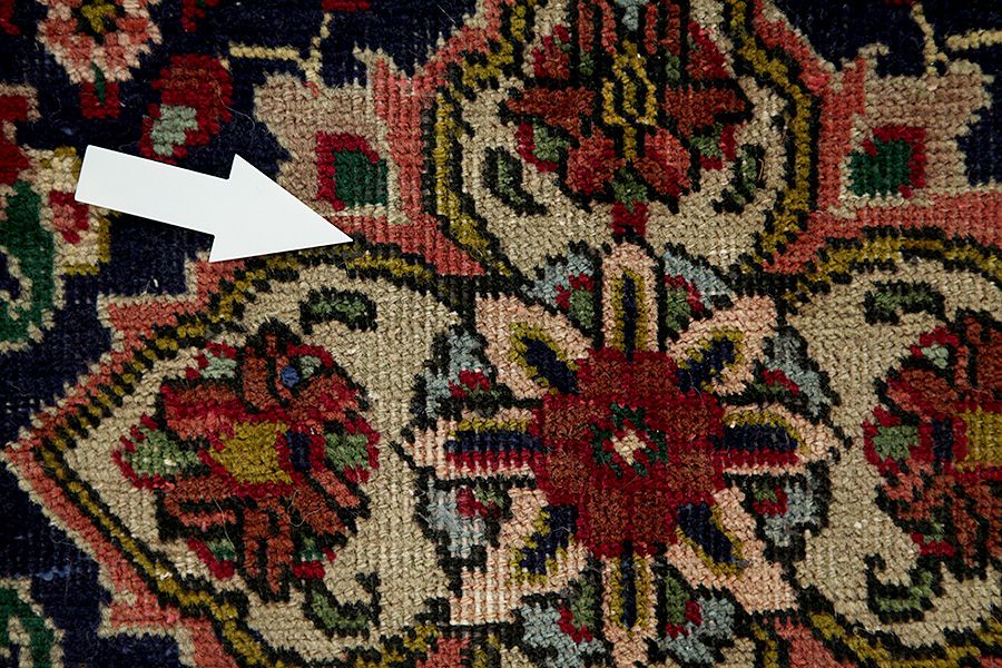 Abrash: Due to the different amount of grease in the wool and the added salt during the process of dyeing, the wool has got a varying colour absorbance. This is not very visible before weaving. During the weaving though, lines of the same colour are formed in the rug. This is called Abrash (which in Farsi means little cloud) and it shows that the wool was not manufactured using chemical means and marks the naturalness and authenticity of the rugs. Examples