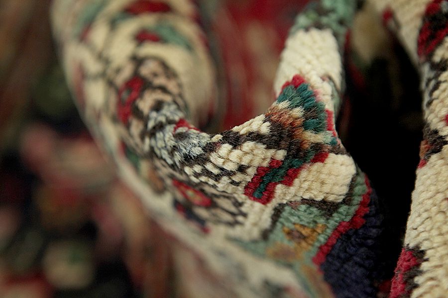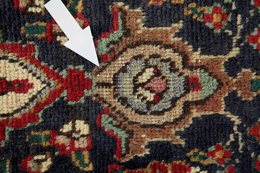 Abrash: Due to the different amount of grease in the wool and the added salt during the process of dyeing, the wool has got a varying colour absorbance. This is not very visible before weaving. During the weaving though, lines of the same colour are formed in the rug. This is called Abrash (which in Farsi means little cloud) and it shows that the wool was not manufactured using chemical means and marks the naturalness and authenticity of the rugs. Examples