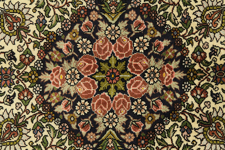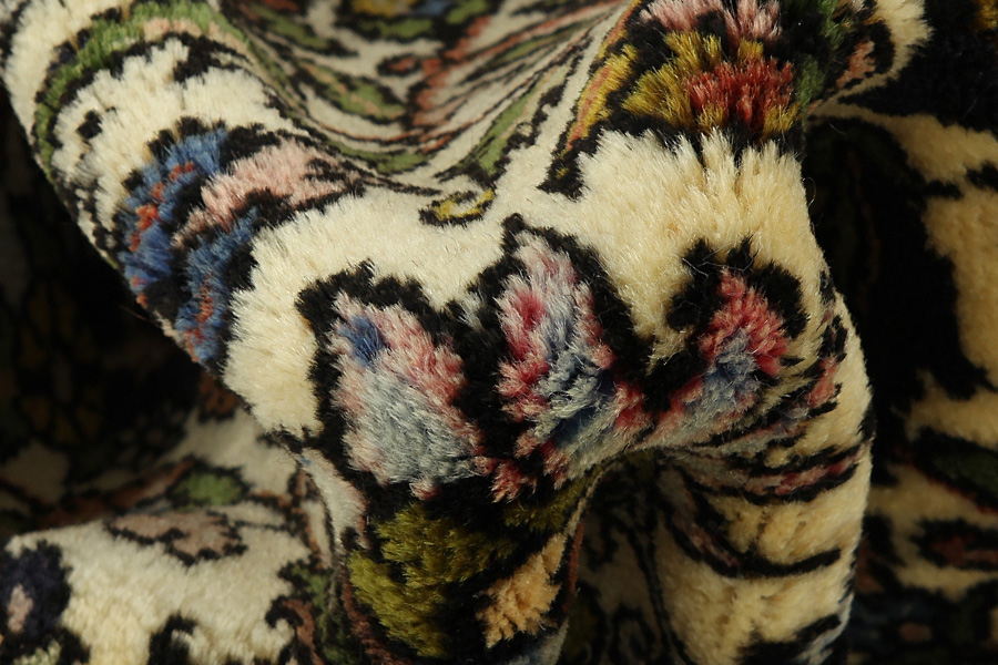 Abrash: Due to the different amount of grease in the wool and the added salt during the process of dyeing, the wool has got a varying colour absorbance. This is not very visible before weaving. During the weaving though, lines of the same colour are formed in the rug. This is called Abrash (which in Farsi means little cloud) and it shows that the wool was not manufactured using chemical means and marks the naturalness and authenticity of the rugs. Examples