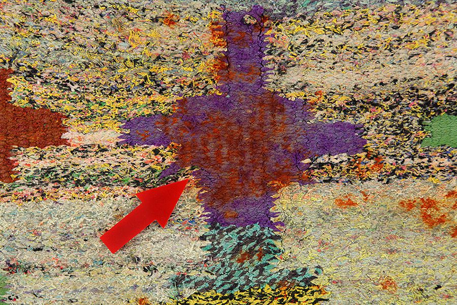 Abrash: Due to the different amount of grease in the wool and the added salt during the process of dyeing, the wool has got a varying colour absorbance. This is not very visible before weaving. During the weaving though, lines of the same colour are formed in the rug. This is called Abrash (which in Farsi means little cloud) and it shows that the wool was not manufactured using chemical means and marks the naturalness and authenticity of the rugs. Examples