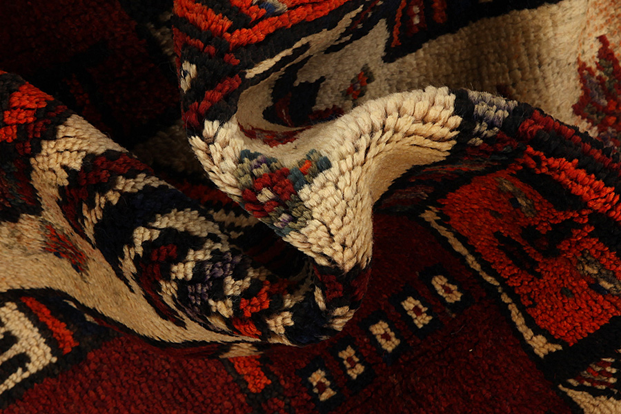 Qashqai Rugs : Qashqai rugs are woven by nomads who live in the mountainous areas of Southwest Persia, the provinces of Fars, Khuzestan, south of Isfahan and around the city Shiraz. Their rugs have a high knot density and a wide variety of designs, usually in deep red and blue colours. They weave rugs, Kilims and decorative textiles (ribbons, bags, etc.), which depict scenes from their lives with various representation of humans, animals, birds, trees and flowers.