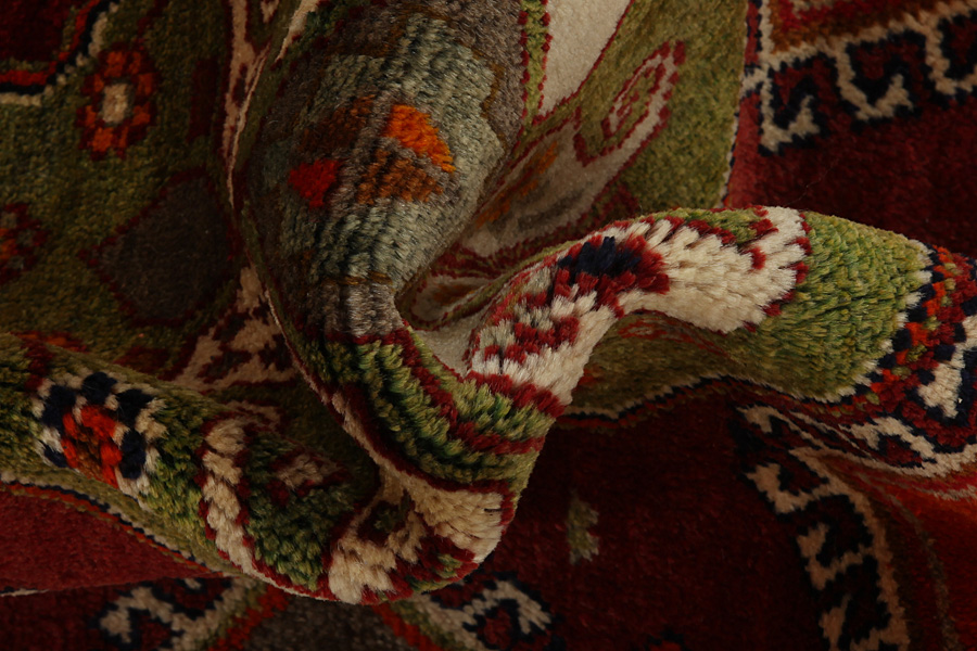 Abrash: Due to the different amount of grease in the wool and the added salt during the process of dyeing, the wool has got a varying colour absorbance. This is not very visible before weaving. During the weaving though, lines of the same colour are formed in the rug. This is called Abrash (which in Farsi means little cloud) and it shows that the wool was not manufactured using chemical means and marks the naturalness and authenticity of the rugs. Examples