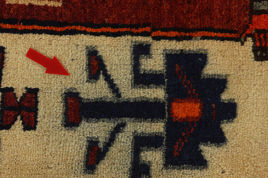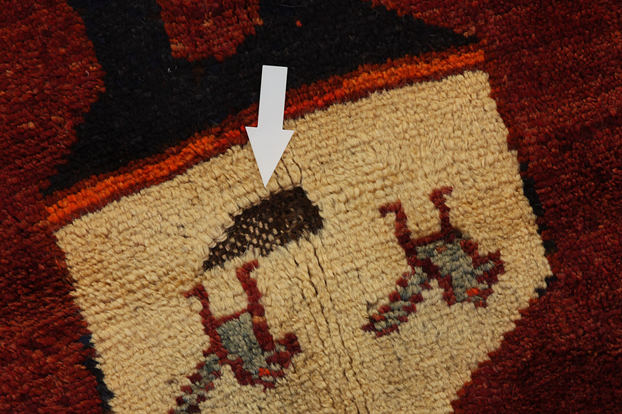 Abrash: Due to the different amount of grease in the wool and the added salt during the process of dyeing, the wool has got a varying colour absorbance. This is not very visible before weaving. During the weaving though, lines of the same colour are formed in the rug. This is called Abrash (which in Farsi means little cloud) and it shows that the wool was not manufactured using chemical means and marks the naturalness and authenticity of the rugs. Examples