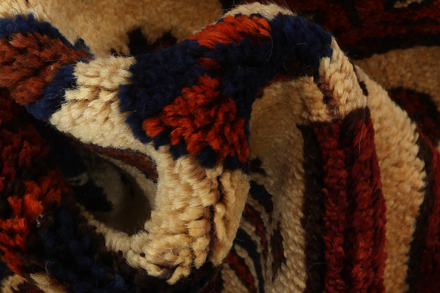 Abrash: Due to the different amount of grease in the wool and the added salt during the process of dyeing, the wool has got a varying colour absorbance. This is not very visible before weaving. During the weaving though, lines of the same colour are formed in the rug. This is called Abrash (which in Farsi means little cloud) and it shows that the wool was not manufactured using chemical means and marks the naturalness and authenticity of the rugs. Examples