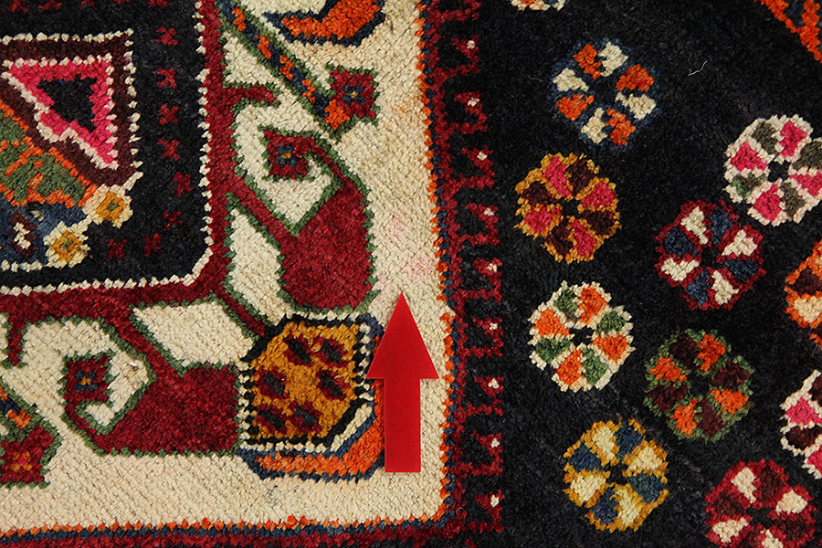 Abrash: Due to the different amount of grease in the wool and the added salt during the process of dyeing, the wool has got a varying colour absorbance. This is not very visible before weaving. During the weaving though, lines of the same colour are formed in the rug. This is called Abrash (which in Farsi means little cloud) and it shows that the wool was not manufactured using chemical means and marks the naturalness and authenticity of the rugs. Examples