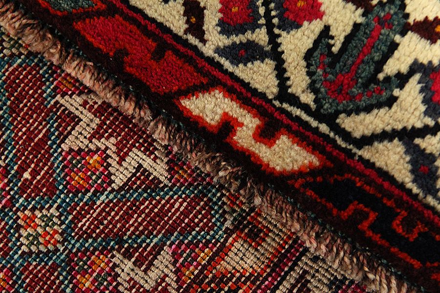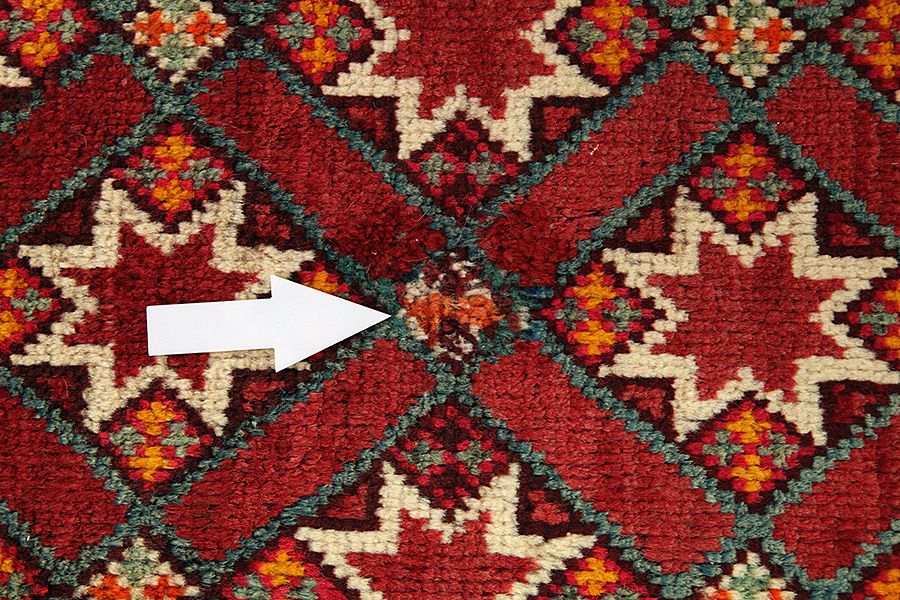 Abrash: Due to the different amount of grease in the wool and the added salt during the process of dyeing, the wool has got a varying colour absorbance. This is not very visible before weaving. During the weaving though, lines of the same colour are formed in the rug. This is called Abrash (which in Farsi means little cloud) and it shows that the wool was not manufactured using chemical means and marks the naturalness and authenticity of the rugs. Examples