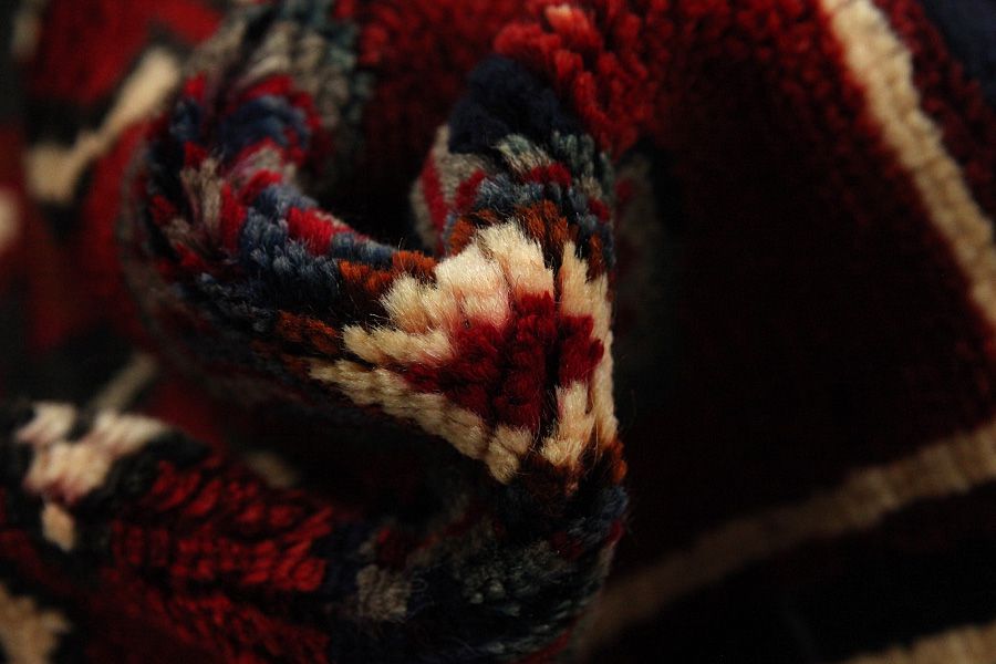 Abrash: Due to the different amount of grease in the wool and the added salt during the process of dyeing, the wool has got a varying colour absorbance. This is not very visible before weaving. During the weaving though, lines of the same colour are formed in the rug. This is called Abrash (which in Farsi means little cloud) and it shows that the wool was not manufactured using chemical means and marks the naturalness and authenticity of the rugs. Examples