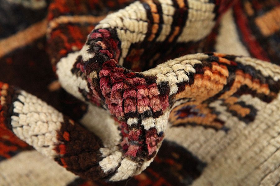 Abrash: Due to the different amount of grease in the wool and the added salt during the process of dyeing, the wool has got a varying colour absorbance. This is not very visible before weaving. During the weaving though, lines of the same colour are formed in the rug. This is called Abrash (which in Farsi means little cloud) and it shows that the wool was not manufactured using chemical means and marks the naturalness and authenticity of the rugs. Examples
