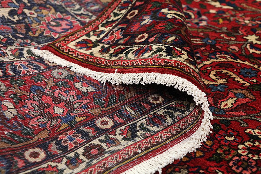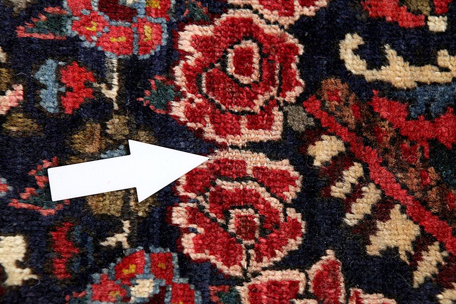 Abrash: Due to the different amount of grease in the wool and the added salt during the process of dyeing, the wool has got a varying colour absorbance. This is not very visible before weaving. During the weaving though, lines of the same colour are formed in the rug. This is called Abrash (which in Farsi means little cloud) and it shows that the wool was not manufactured using chemical means and marks the naturalness and authenticity of the rugs. Examples