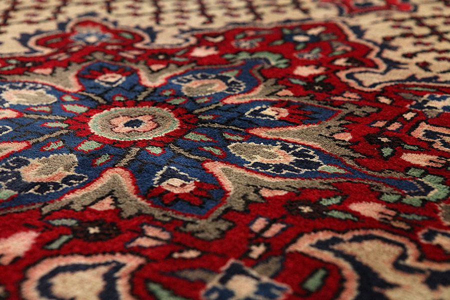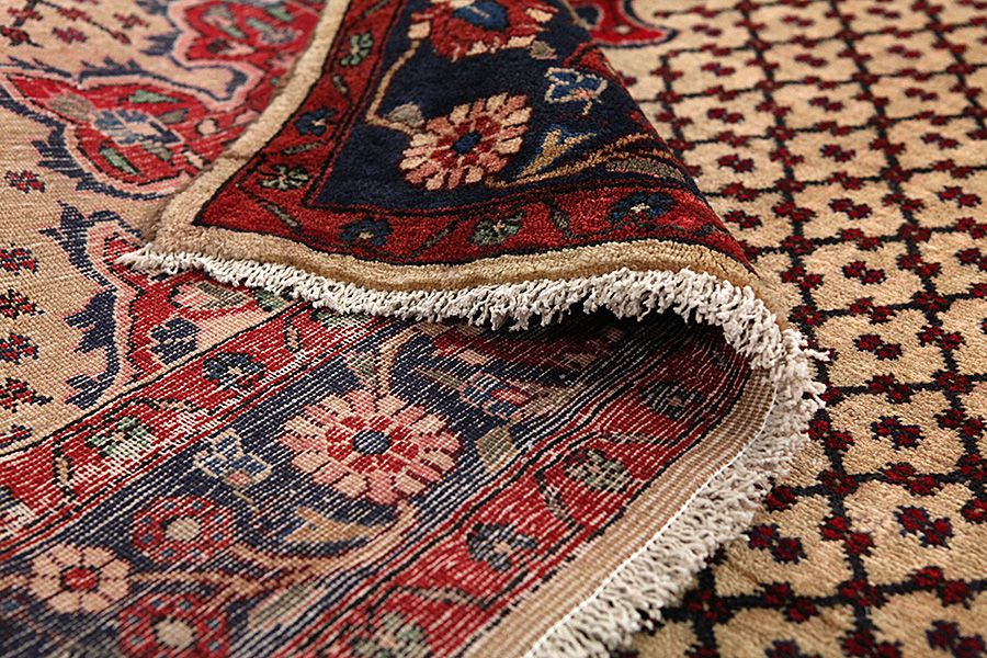 Abrash: Due to the different amount of grease in the wool and the added salt during the process of dyeing, the wool has got a varying colour absorbance. This is not very visible before weaving. During the weaving though, lines of the same colour are formed in the rug. This is called Abrash (which in Farsi means little cloud) and it shows that the wool was not manufactured using chemical means and marks the naturalness and authenticity of the rugs. Examples