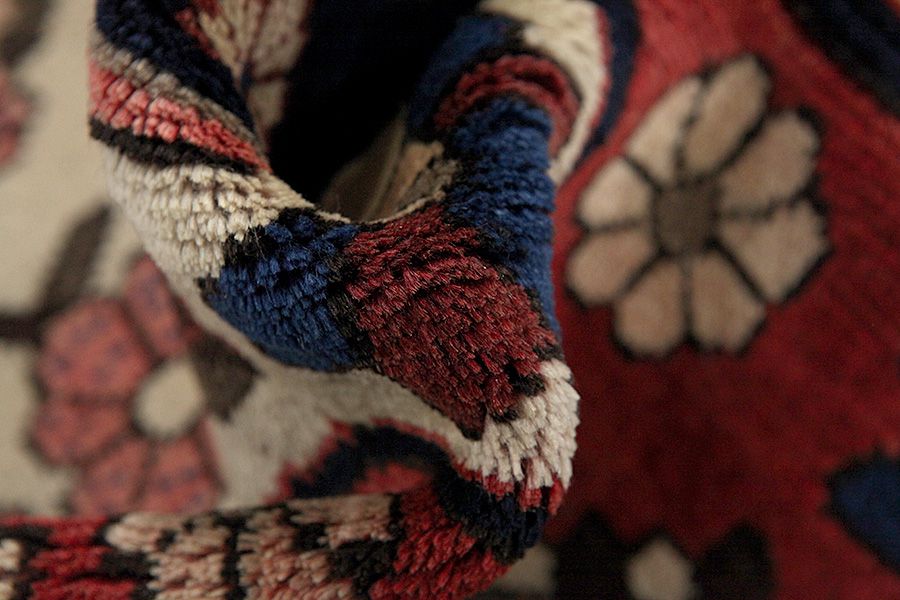 Abrash: Due to the different amount of grease in the wool and the added salt during the process of dyeing, the wool has got a varying colour absorbance. This is not very visible before weaving. During the weaving though, lines of the same colour are formed in the rug. This is called Abrash (which in Farsi means little cloud) and it shows that the wool was not manufactured using chemical means and marks the naturalness and authenticity of the rugs. Examples