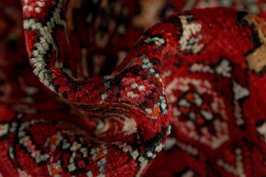 Abrash: Due to the different amount of grease in the wool and the added salt during the process of dyeing, the wool has got a varying colour absorbance. This is not very visible before weaving. During the weaving though, lines of the same colour are formed in the rug. This is called Abrash (which in Farsi means little cloud) and it shows that the wool was not manufactured using chemical means and marks the naturalness and authenticity of the rugs. Examples