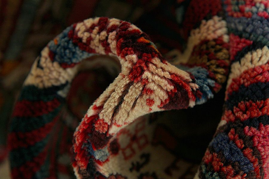 Abrash: Due to the different amount of grease in the wool and the added salt during the process of dyeing, the wool has got a varying colour absorbance. This is not very visible before weaving. During the weaving though, lines of the same colour are formed in the rug. This is called Abrash (which in Farsi means little cloud) and it shows that the wool was not manufactured using chemical means and marks the naturalness and authenticity of the rugs. Examples