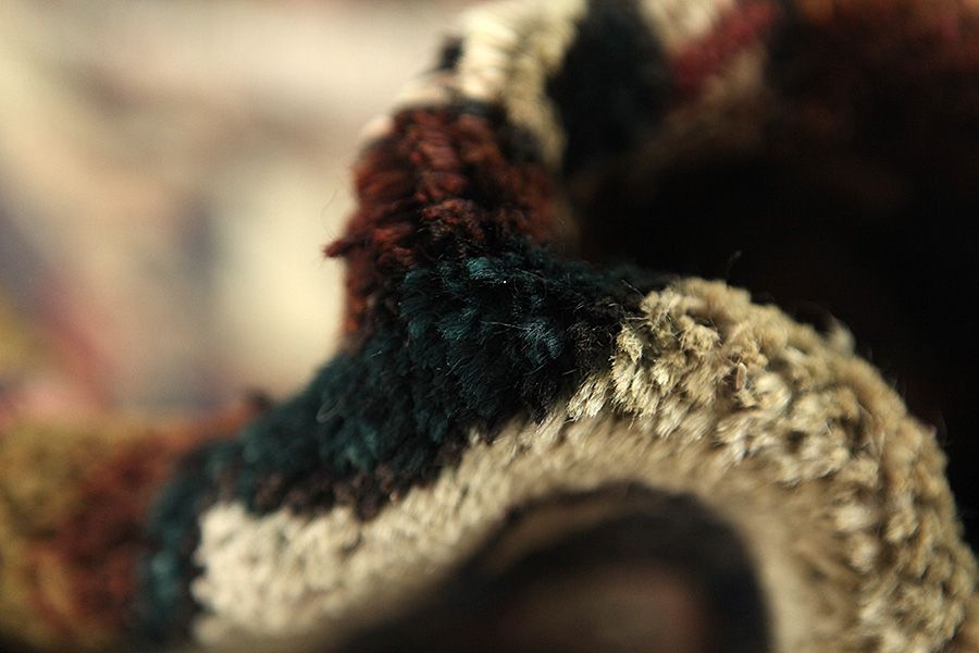 Abrash: Due to the different amount of grease in the wool and the added salt during the process of dyeing, the wool has got a varying colour absorbance. This is not very visible before weaving. During the weaving though, lines of the same colour are formed in the rug. This is called Abrash (which in Farsi means little cloud) and it shows that the wool was not manufactured using chemical means and marks the naturalness and authenticity of the rugs. Examples