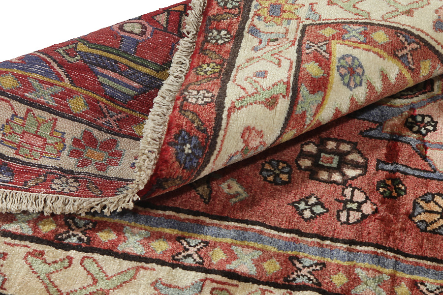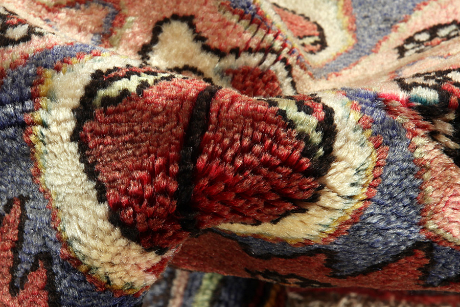 Abrash: Due to the different amount of grease in the wool and the added salt during the process of dyeing, the wool has got a varying colour absorbance. This is not very visible before weaving. During the weaving though, lines of the same colour are formed in the rug. This is called Abrash (which in Farsi means little cloud) and it shows that the wool was not manufactured using chemical means and marks the naturalness and authenticity of the rugs. Examples