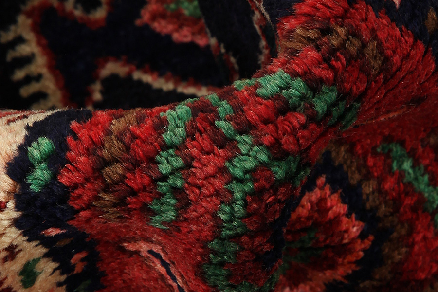 Abrash: Due to the different amount of grease in the wool and the added salt during the process of dyeing, the wool has got a varying colour absorbance. This is not very visible before weaving. During the weaving though, lines of the same colour are formed in the rug. This is called Abrash (which in Farsi means little cloud) and it shows that the wool was not manufactured using chemical means and marks the naturalness and authenticity of the rugs. Examples