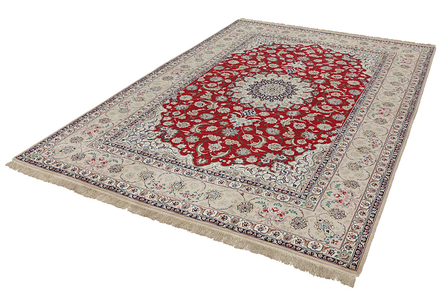 Isfahan Rugs : In the centre of Iran among the Zagros Mountains and the desert, lies the city of Isfahan. Nowadays it is an important industrial city with a population of 1.2 million. The town is an architectural masterpiece. The old rugs of Isfahan incontrast with the newer ones didn't have got a central medallion. The entire surface of the rug was filled with elaborate spiral flowers and flower palmettes. The newer Isfahan rugs cannot be compared with those wonderful old specimens which were manufactured exclusively for nobles. But continuing the tradition, today's rugs of Isfahan also have a very fine weave and are clipped very short to reveal their design more clearly. In the weaving they also use silk to highlight certain areas of the design, especially in flowers. The warp is made of silk or cotton.