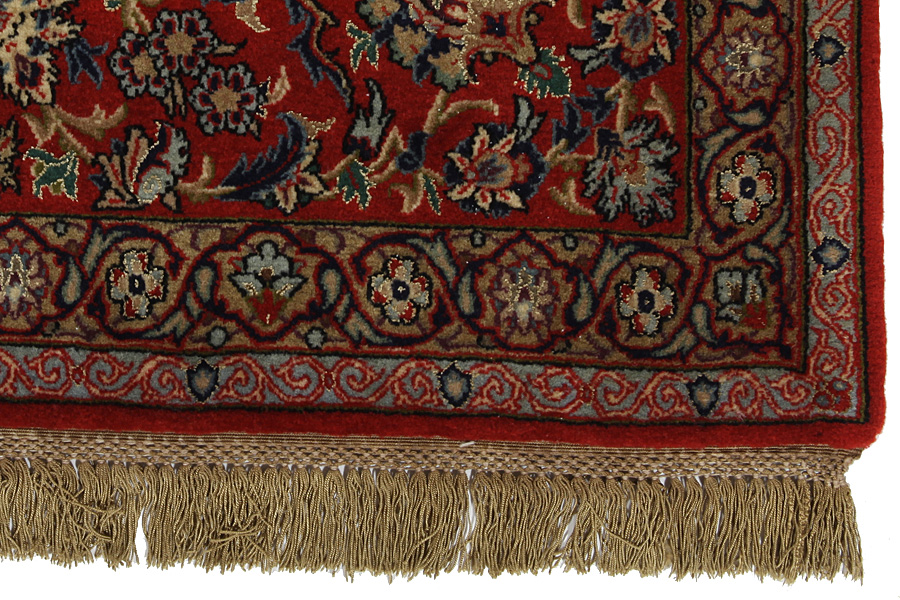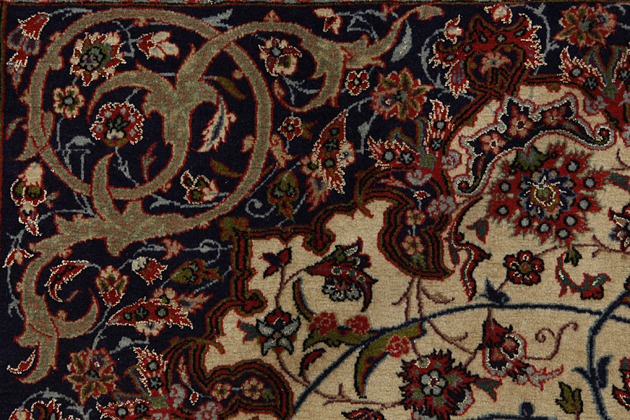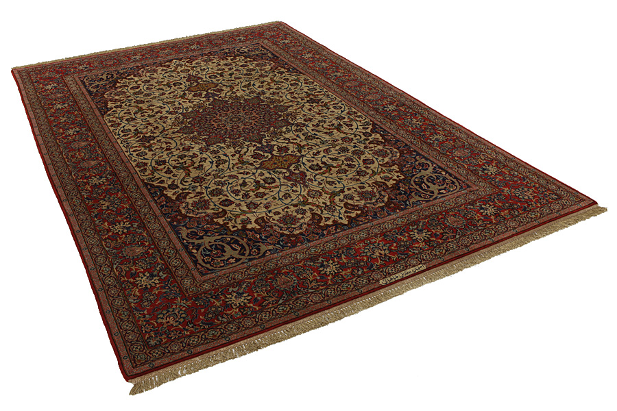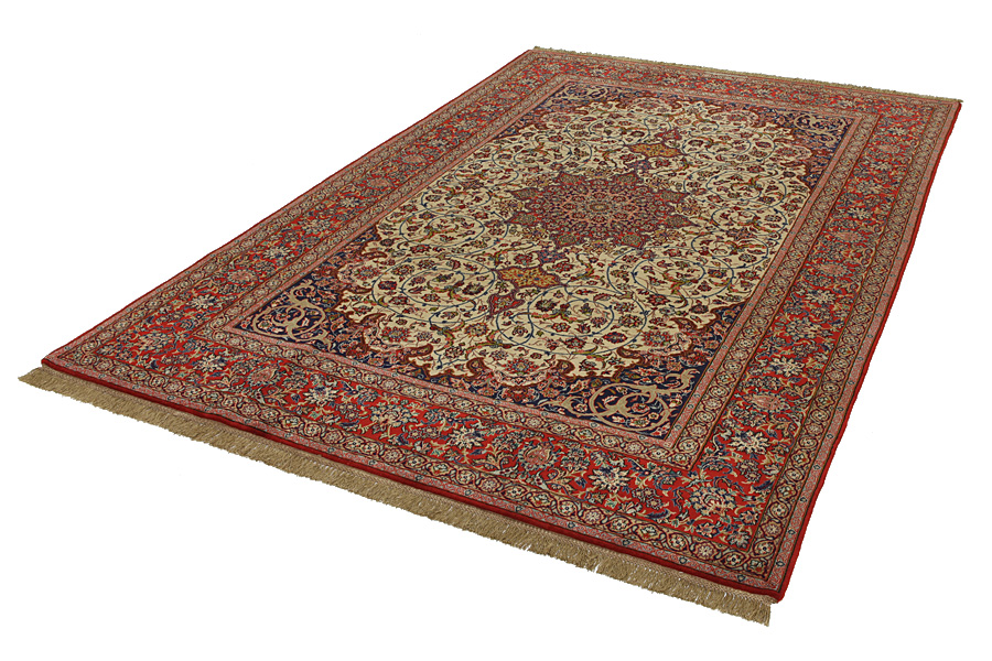 Isfahan Rugs : In the centre of Iran among the Zagros Mountains and the desert, lies the city of Isfahan. Nowadays it is an important industrial city with a population of 1.2 million. The town is an architectural masterpiece. The old rugs of Isfahan incontrast with the newer ones didn't have got a central medallion. The entire surface of the rug was filled with elaborate spiral flowers and flower palmettes. The newer Isfahan rugs cannot be compared with those wonderful old specimens which were manufactured exclusively for nobles. But continuing the tradition, today's rugs of Isfahan also have a very fine weave and are clipped very short to reveal their design more clearly. In the weaving they also use silk to highlight certain areas of the design, especially in flowers. The warp is made of silk or cotton.