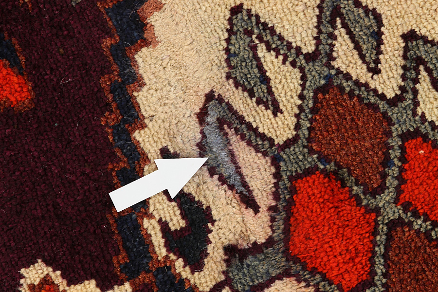 Abrash: Due to the different amount of grease in the wool and the added salt during the process of dyeing, the wool has got a varying colour absorbance. This is not very visible before weaving. During the weaving though, lines of the same colour are formed in the rug. This is called Abrash (which in Farsi means little cloud) and it shows that the wool was not manufactured using chemical means and marks the naturalness and authenticity of the rugs. Examples
