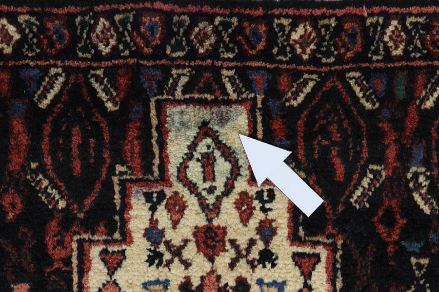 Abrash: Due to the different amount of grease in the wool and the added salt during the process of dyeing, the wool has got a varying colour absorbance. This is not very visible before weaving. During the weaving though, lines of the same colour are formed in the rug. This is called Abrash (which in Farsi means little cloud) and it shows that the wool was not manufactured using chemical means and marks the naturalness and authenticity of the rugs. Examples